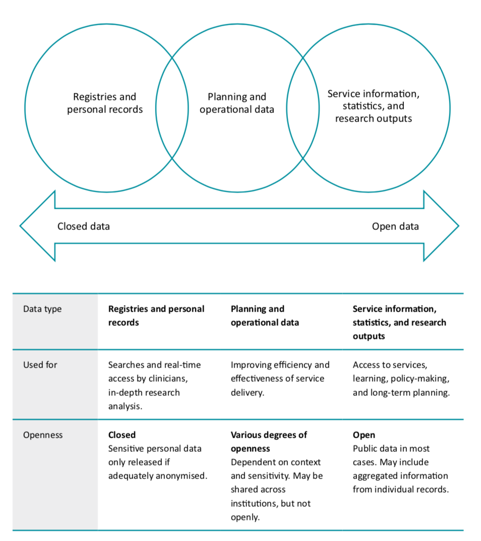 Data about health is often considered some of the most sensitive information collected and held by governments and institutions. Yet over the last decade, there have been a number of initiatives focused on open data in the health sector. Broad et al. describe open data as “data made available by governments, businesses, and individuals for anyone to access, use and share”.1Clearly this should not apply to the detailed personal information within health registers. So, when it comes to open data and health, it is paramount to understand the particular data held within each system, to think carefully about the levels of access that different stakeholders may want or need, and to determine how, or whether, the data may be safely anonymised prior to publication as open data. To do this, it is useful to consider a data spectrum for health, to enumerate the different stakeholders creating and using data, and to consider the challenges they must overcome before open data in the health sector can evolve from being a minor sub-community and enter the mainstream.