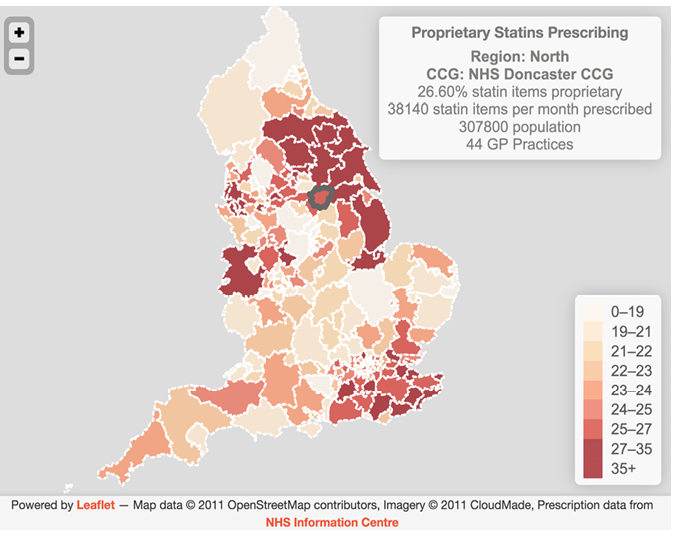Figure 3: Percentage of proprietary statin prescribing by CCG September 2011 to May 2012. Source: www.prescribinganalytics.com